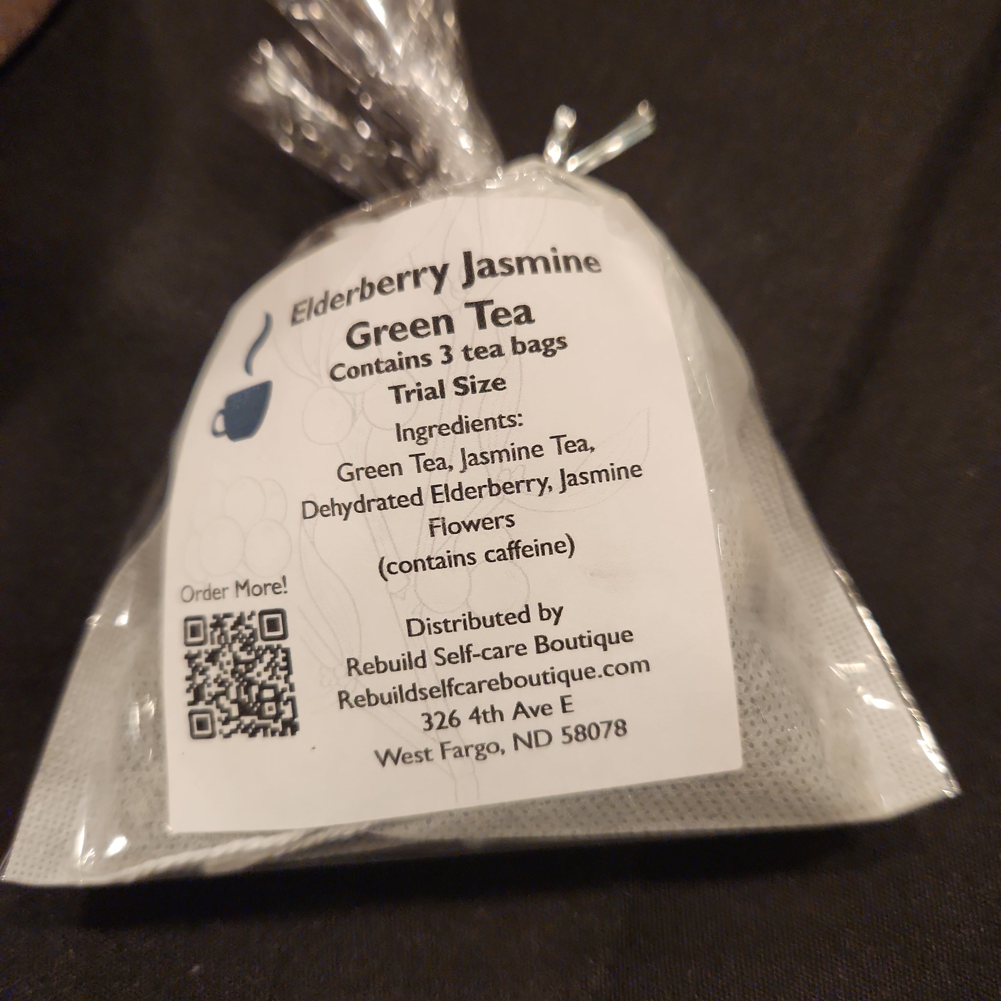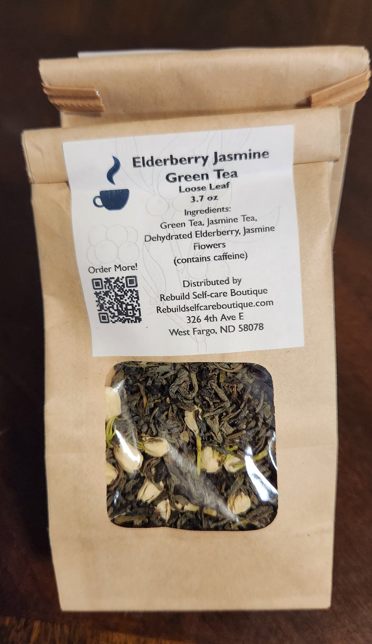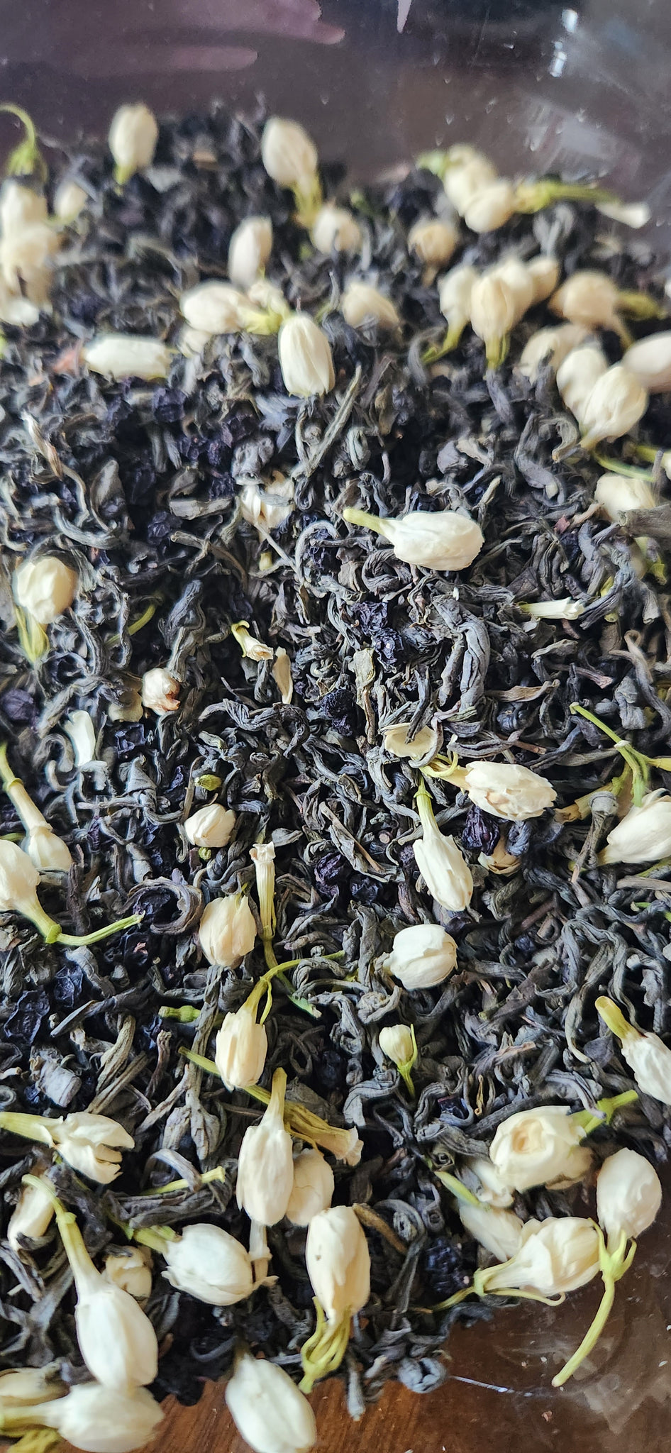 Green Tea, Jasmine Tea, Dehydrated Elderberries, Jasmine Flowers
